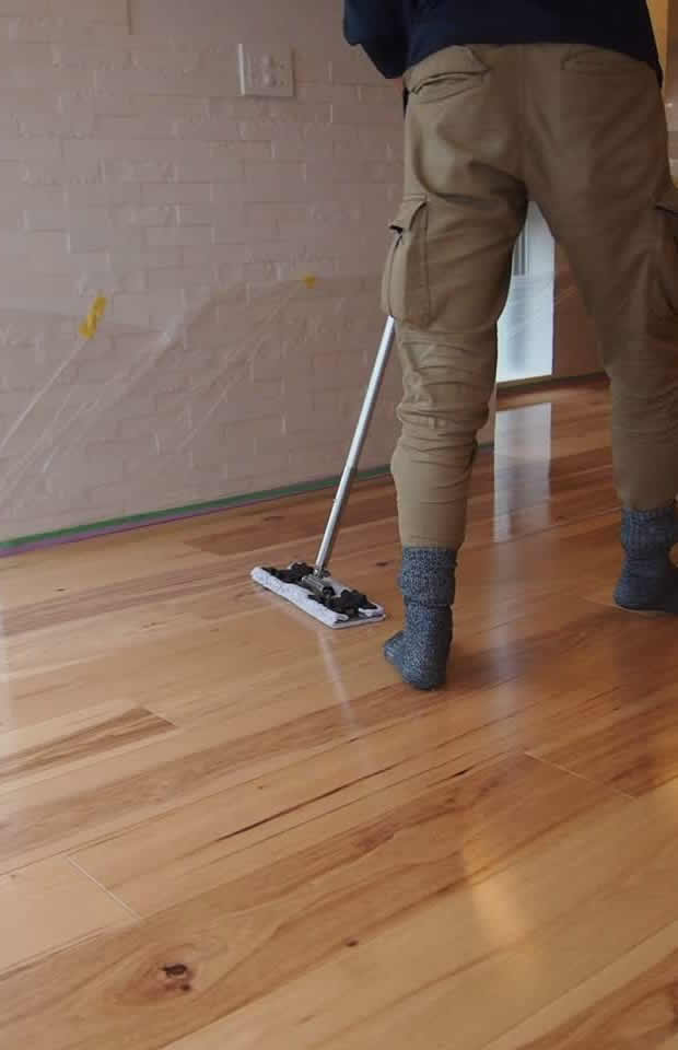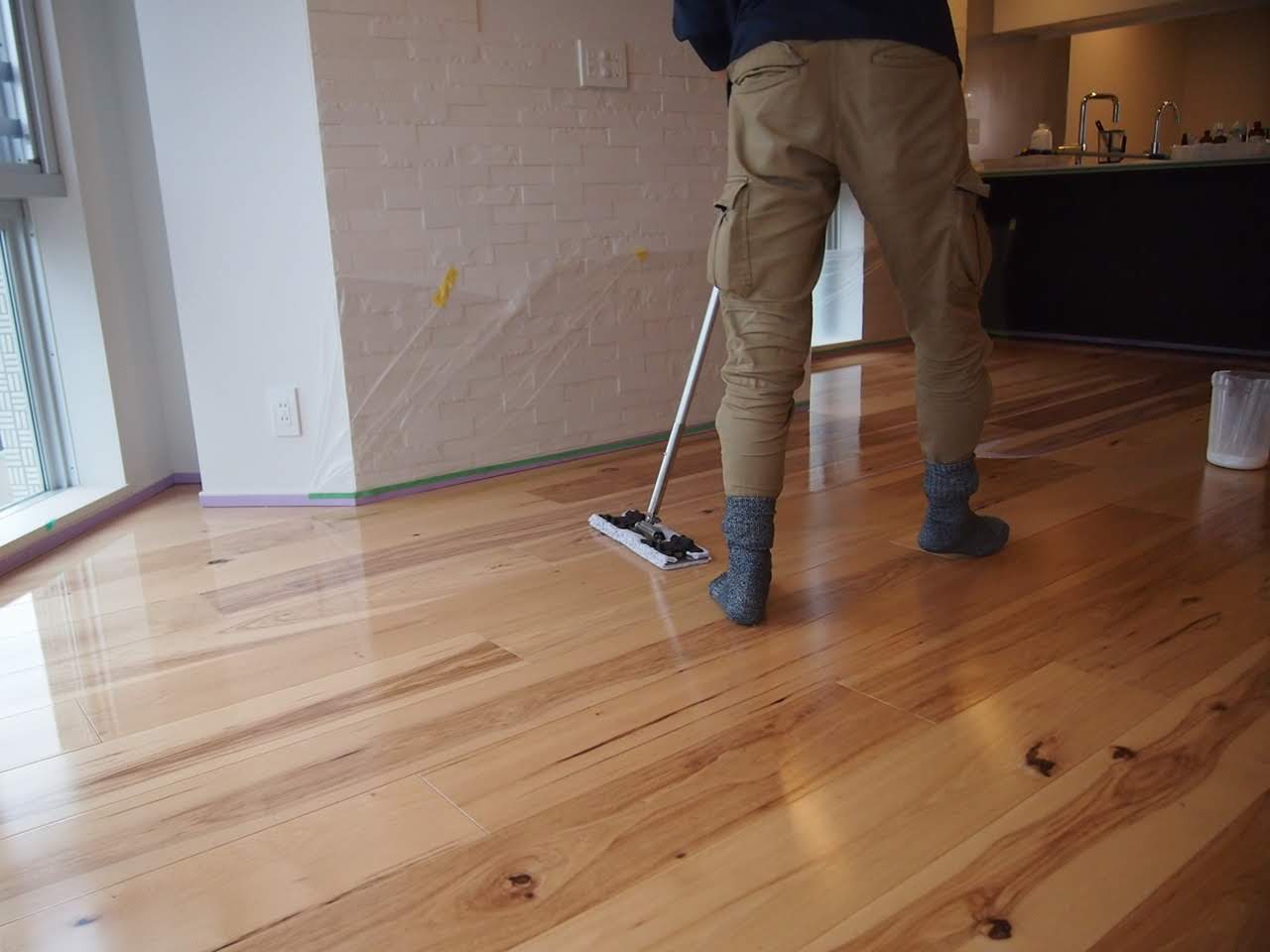 新築の現場であっても、建築中についた汚れは完全には落としきれていないことがほとんどです。水拭きをすると、所どころ水を弾く部分があります。よく見ると、それが手のひらの形だったり、足跡だったりします。フローリング工事に使用した接着剤の成分などが残っているのです。このような微妙な汚れを完全に取り除くことで、将来の変色や、塗膜の層間剝離を未然に防ぐことができるのです。